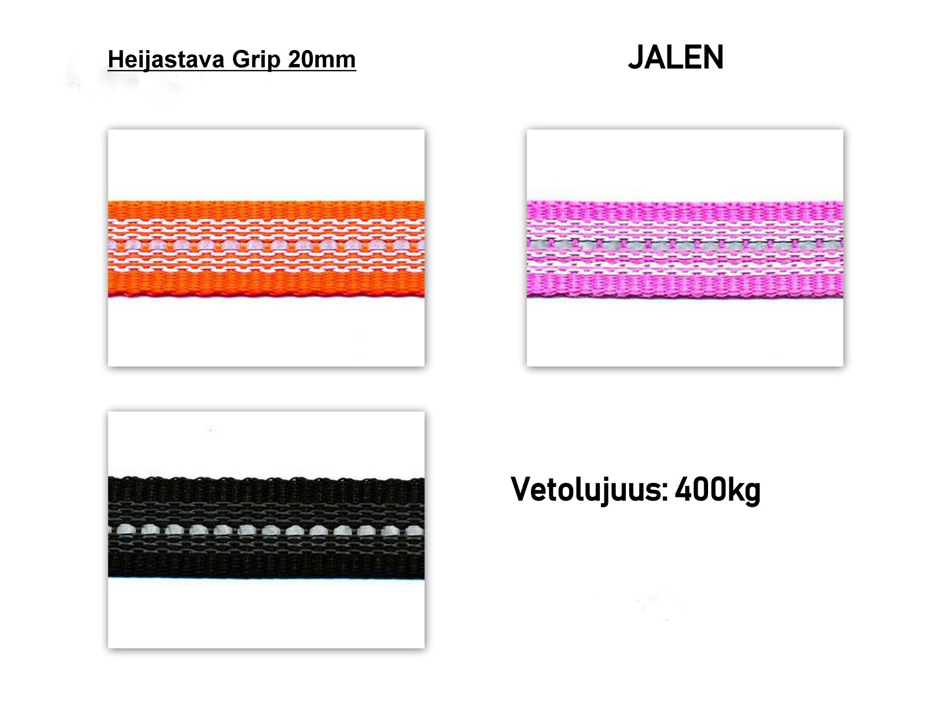 -Heijastava Grip pehmeä 20mm leveä ja 2.8mm paksu: musta, pink ja oranssi. Murtolujuus 400kg.